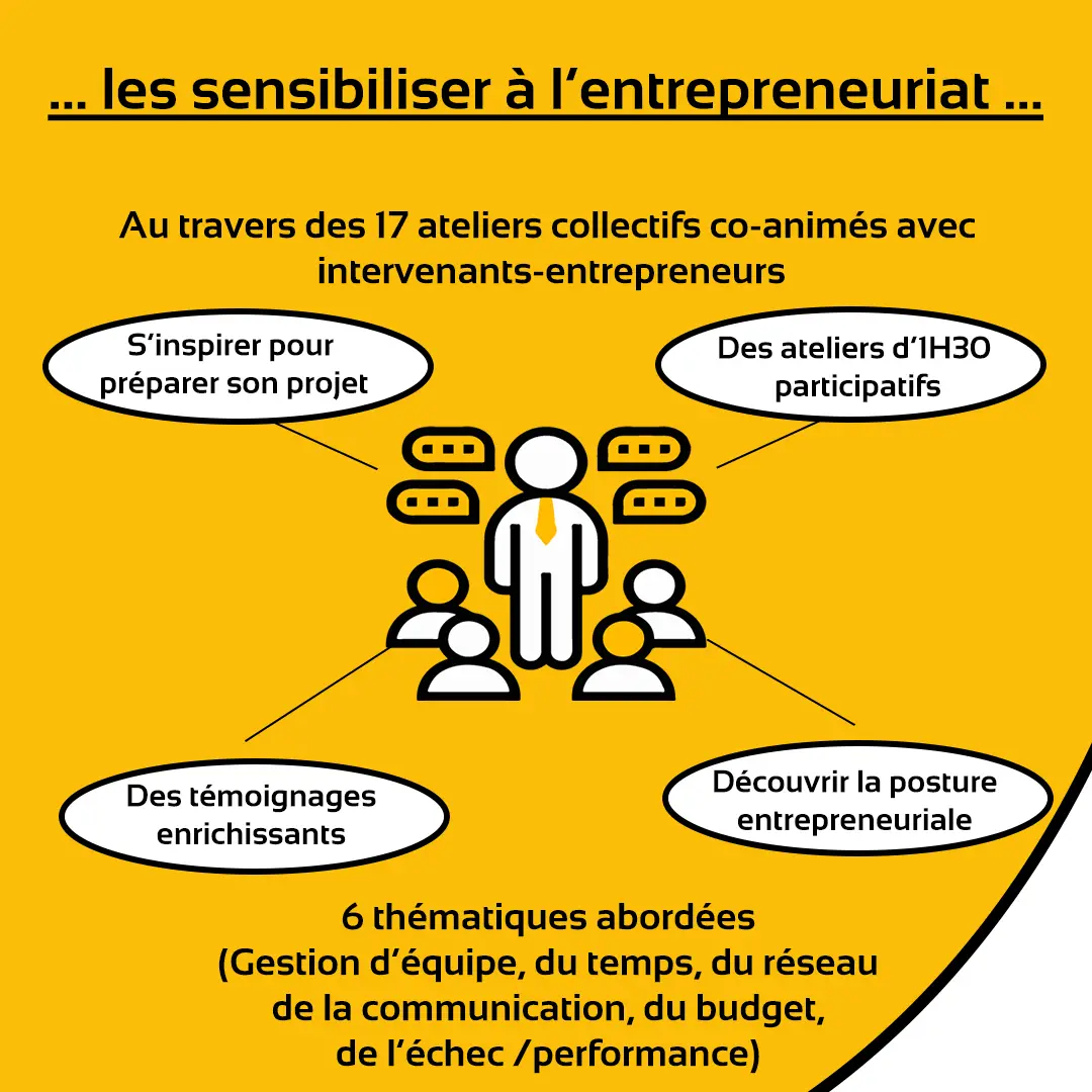 Nous nous engageons, auprès de nos bénéficiaires, à ce qu’à chaque atelier, un intervenant professionnel vienne témoigner de son expérience entrepreneuriale. Dans le cadre d’un atelier, nous, équipe Excubateur, nous animons l’intégralité de l’intervention. Ainsi, l’intervenant peut se concentrer sur son témoignage et sur l’échange avec le groupe.